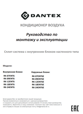 Документы и инструкция к кондиционеру DANTEX ECO PRO RK-24ENT6/RK-24ENT6E